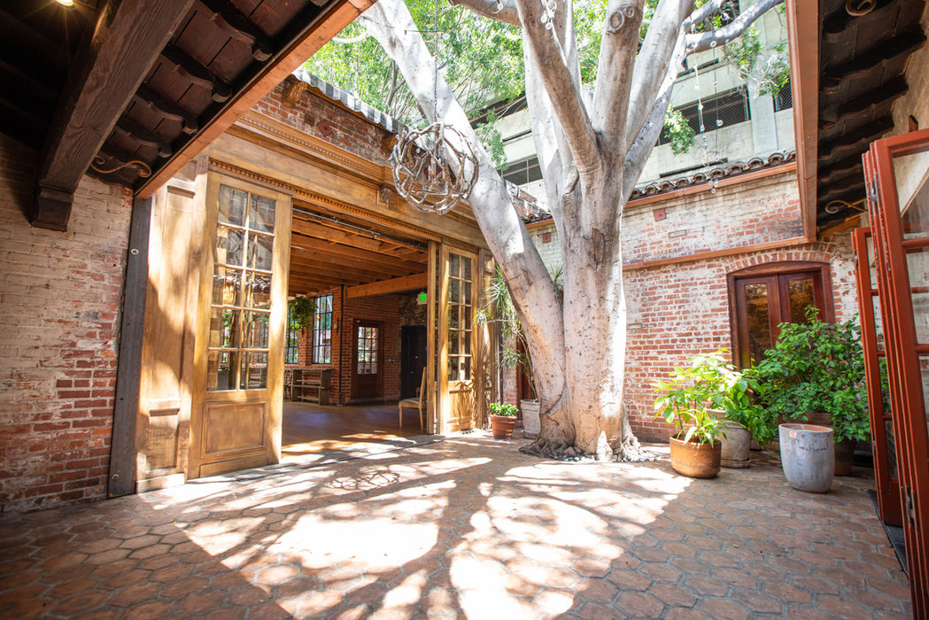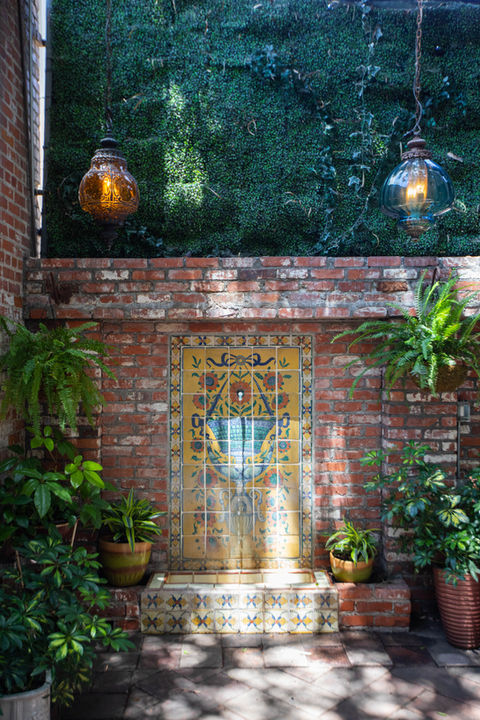 The central courtyard brings life to the heart of the house. The hexagon brick flooring, ornate tiled fountain, soaring tree, soft string lights, and wood chandelier hold you in while outdoors. With its nearly enigmatic existence, the rear courtyard charms you. From the luxuriant jewel lanterns, café style seating, and lush greenery, this space is a secret worth discovering.