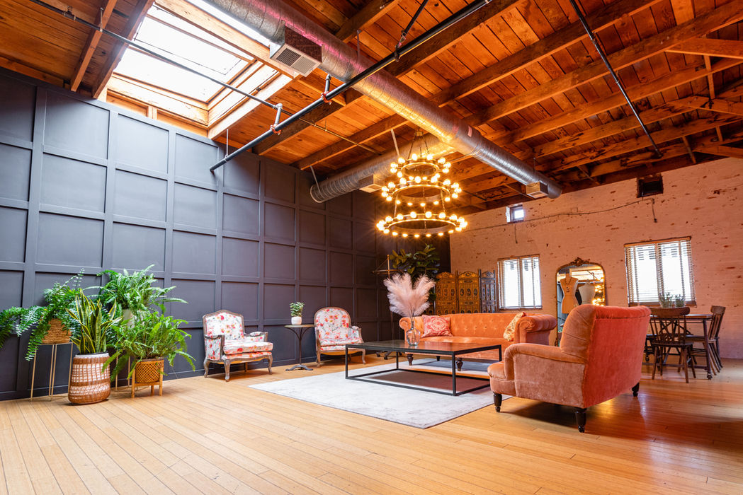Sophistication meets urban flair with exposed wood beam ceilings highlighted by dual skylights and three crystal chandeliers. Wide industrial windows soak light from the courtyard and cascade on the greenery adorning the red brick walls and warm hardwood floors. The principal wall features a mirrored, dark wood altar that reflects this astounding room.